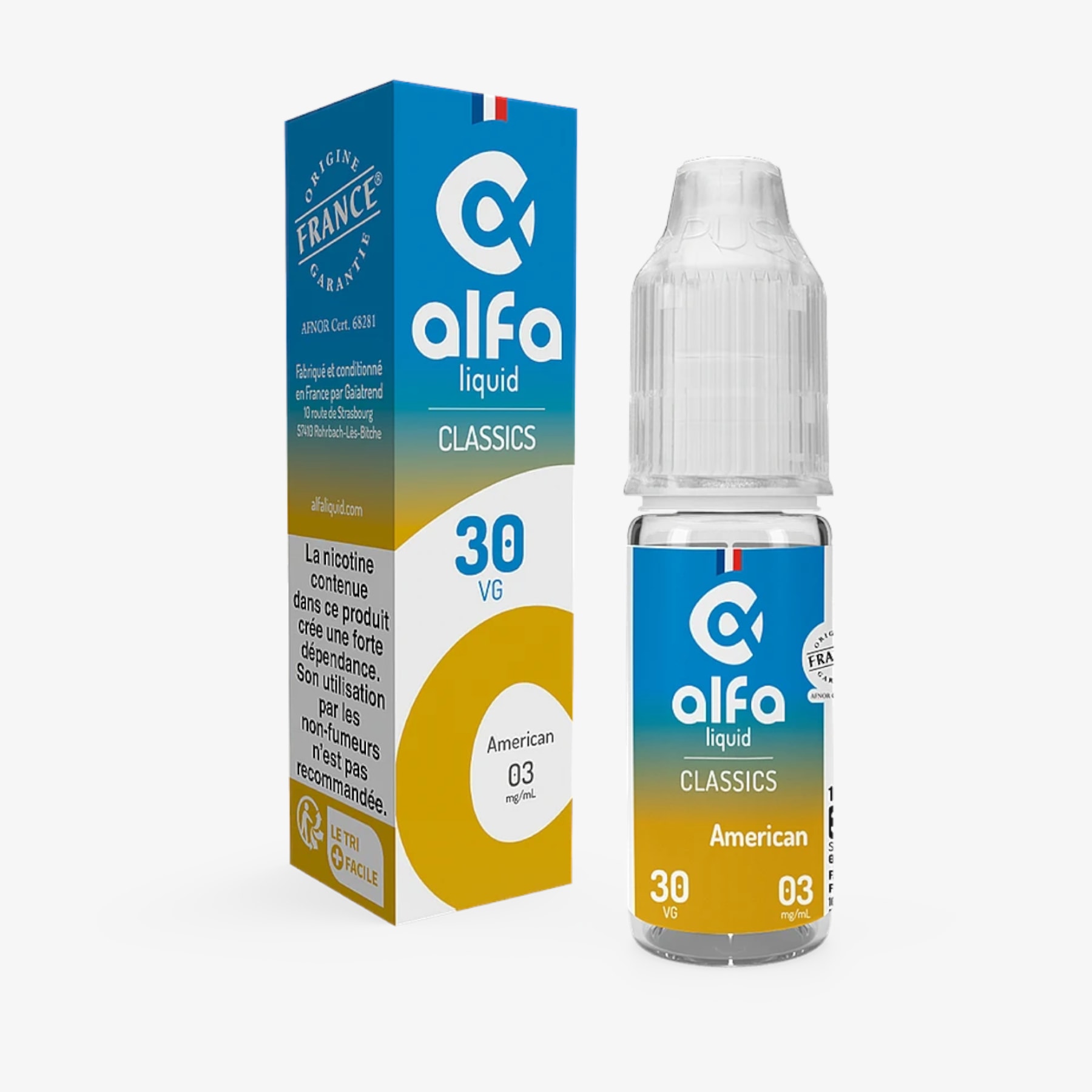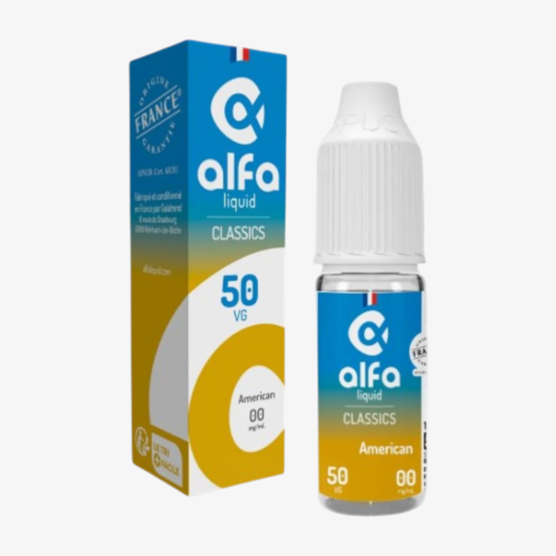 De plus, la marque Alfaliquid n’utilise pour ses e-liquides que des arômes de qualité alimentaire naturels ou de synthèse dans son e-liquide American.