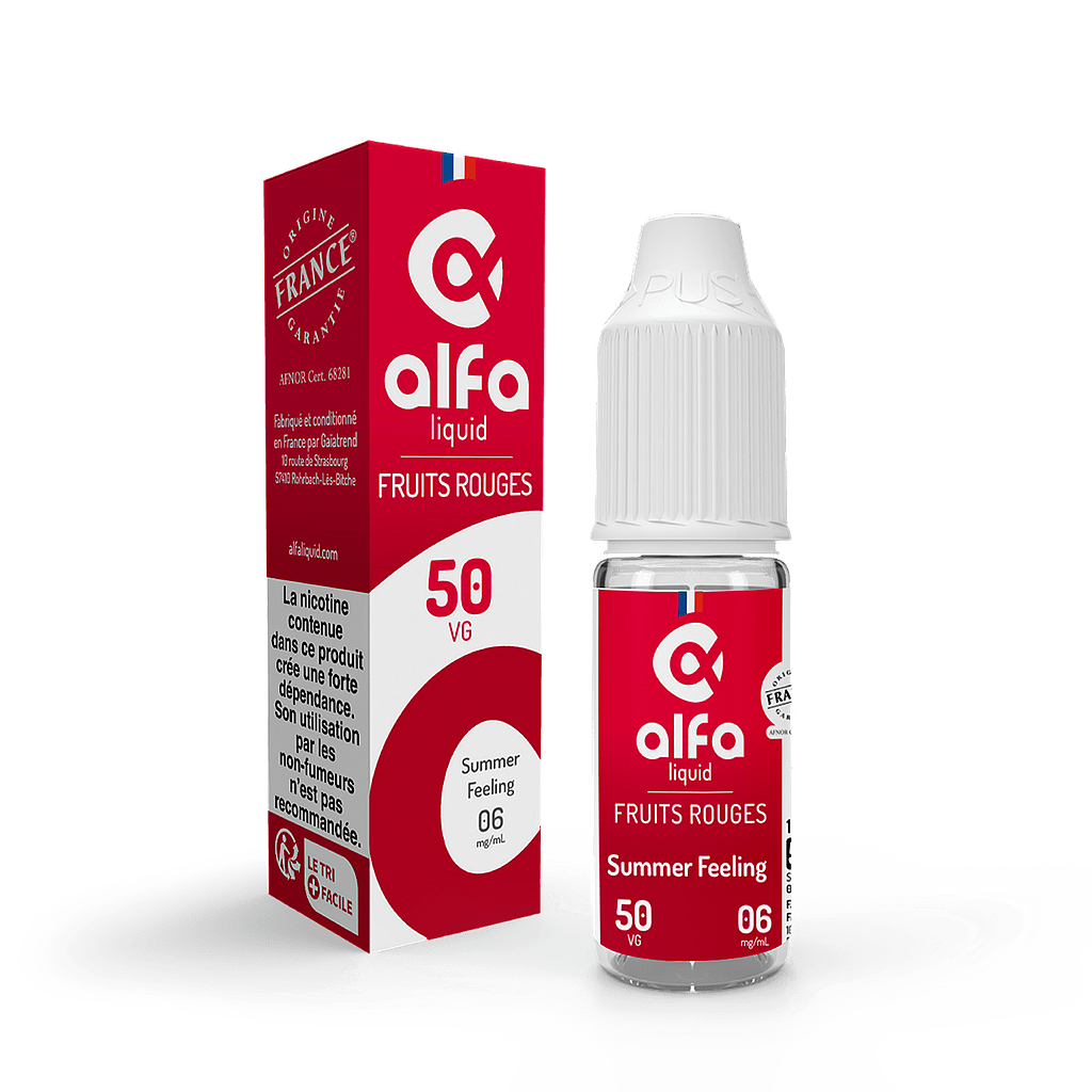 De plus, la marque Alfaliquid n’utilise pour ses e-liquides que des arômes de qualité alimentaire naturels ou de synthèse dans son e-liquide Summer Feeling.