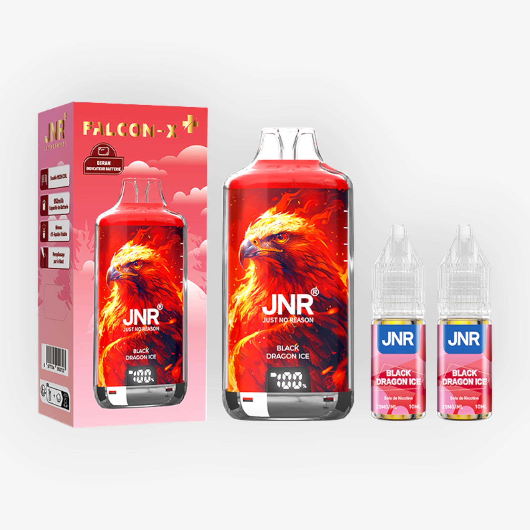 Voici une big puff d'une capacité rare. En effet, vous avez apprécié la 9k Tornado RandM et ses 9000 taffs ? Alors sachez que la JNR Shisha Falcon X offre jusqu'à 28 000 bouffées grâce à un réservoir de 10ml - prérempli de 2ml d'e-liquide - et grâce à une batterie de 950mAh. Elle se recharge au moyen d'un câble USB Type-C (non fourni) et vous pourrez consommer le contenu de 2 fioles de 10ml chacune (fournies) et contenant 20mg de sels de nicotine. De plus, elle est simple d'utilisation et compte un écran indiquant le niveau de charge. Avec la Falcon X de JNR, vous aurez donc droit à une puff de référence, laquelle constitue une évolution par rapport à la JNR Shisha Hookah.