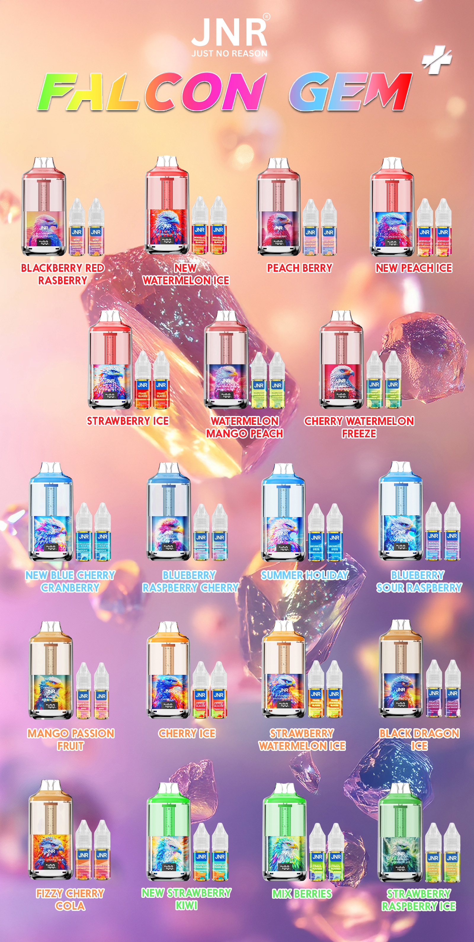 La Falcon Gem+ 30k de JNR constitue une big puff remarquable. En effet, elle compte un réservoir prérempli de 2ml et une batterie intégrée de 950mAh rechargable par le biais d'un câble USB Type-C (non fourni). Elle est également livrée avec 2 fioles de 10ml contenant chacune 20mg de sels de nicotine et, grâce à elles, vous aurez la possibilité de pratiquer la quantité impressionnante de 30000 bouffées. De plus, ce produit possède un écran indiquant le niveau de charge et un système de graduation du niveau d'e-liquide. Voilà donc une puff de référence.